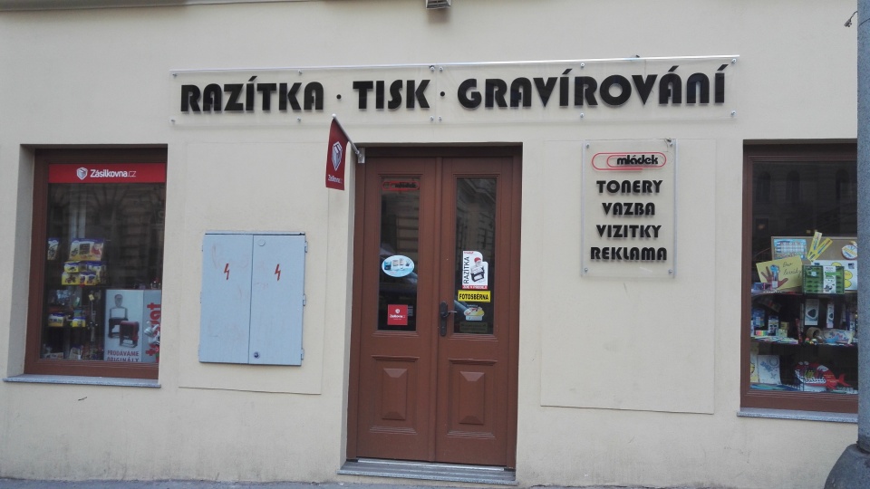 V prodejně kancelářských potřeba Mládek, naproti kostelu sv. Prokopa.