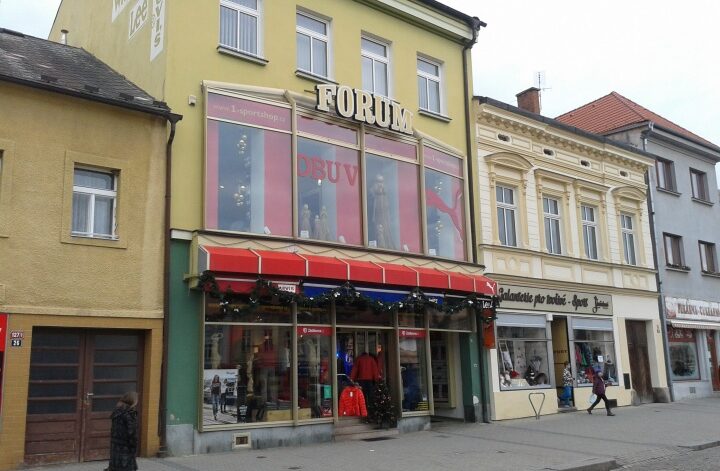 V prodejně džínové módy Lee Wrangler v přízemí obchodního domu Forum, uprostřed Husova náměstí, naproti ČSOB a České poště.