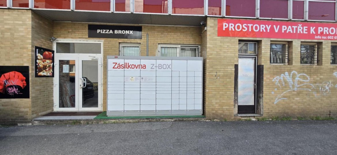 Z-BOX se nachází za rohem, ve výklenku budovy s prodejnami (na rohu se nachází například prodejna potravin a Benu lékárna).