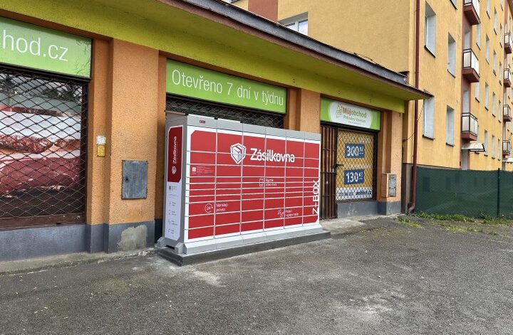 Z-BOX se nachází před prodejnou potravin Můj obchod.