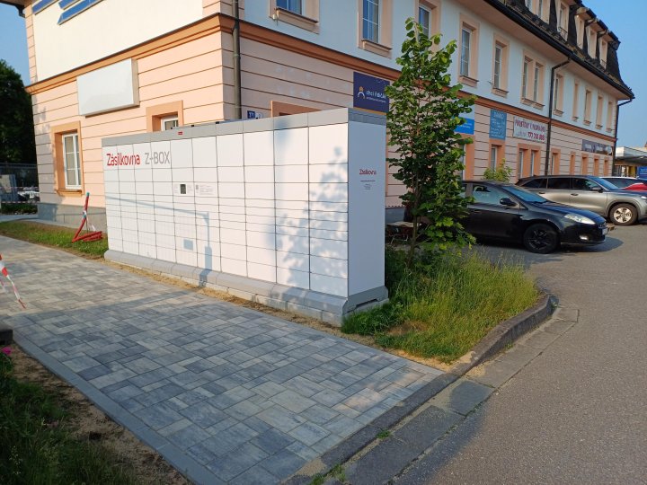 Z-BOX stojí u firmy Intop. Je postavený ze strany budovy kde je finanční úřad.